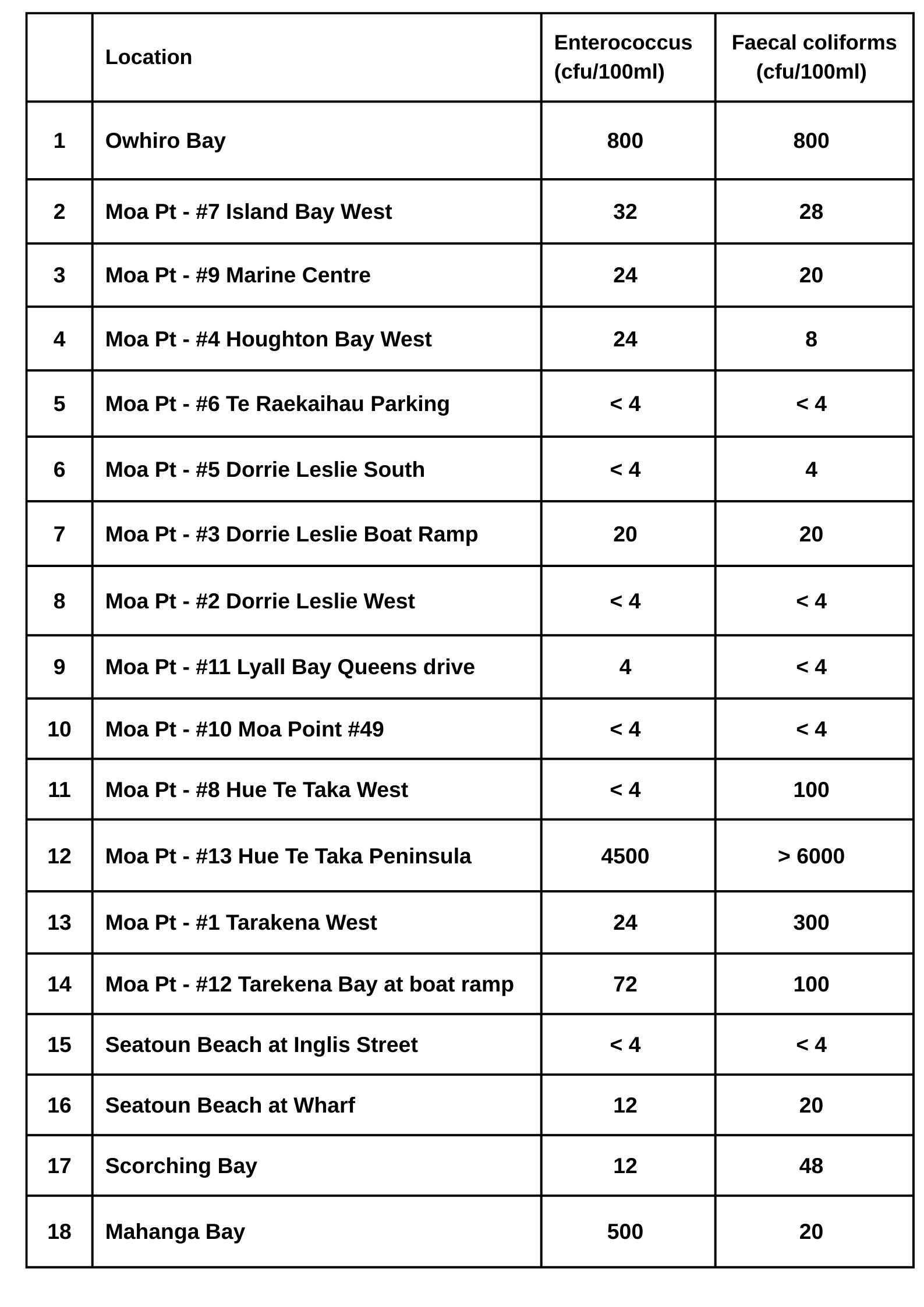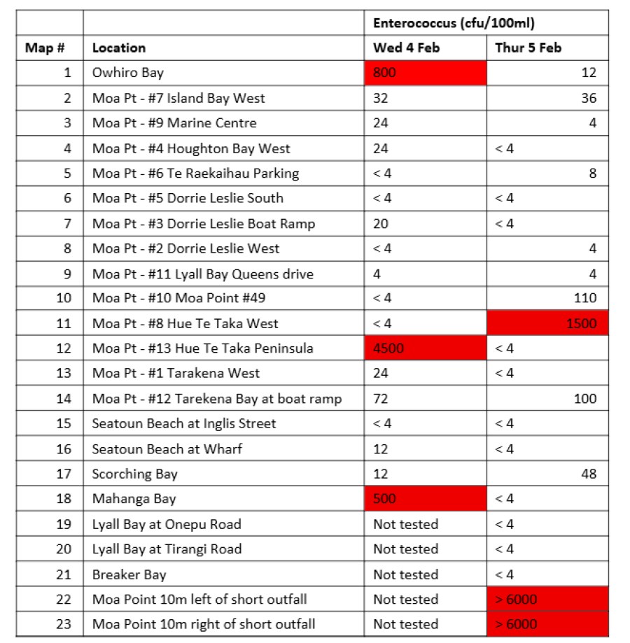 The results from Wednesday cover 18 sampling sites, from Ōwhiro Bay to Mahanga Bay. More sites will be reported in future updates.