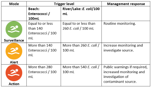 We are reporting levels of enterococcus only, as these are the most reliable indicator of recent faecal contamination and correlate best with human health risks.