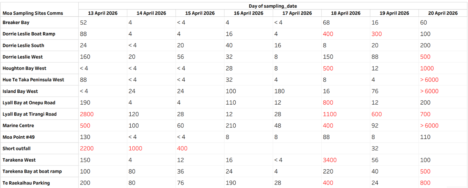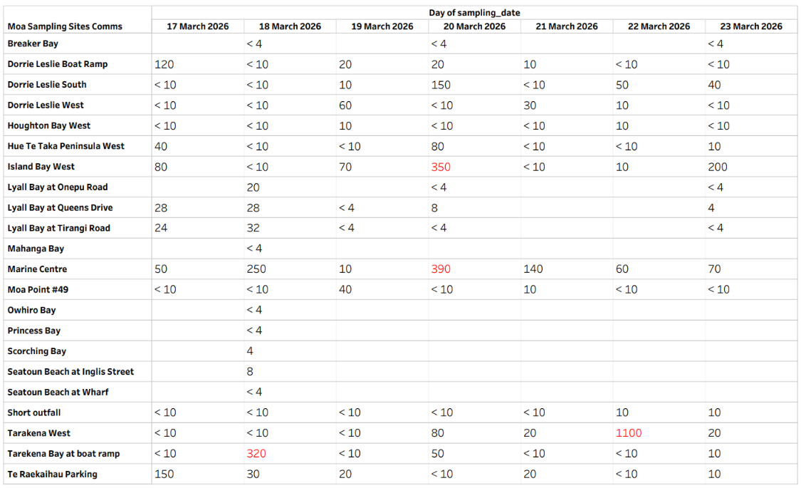 The results from Wednesday cover 18 sampling sites, from Ōwhiro Bay to Mahanga Bay. More sites will be reported in future updates.