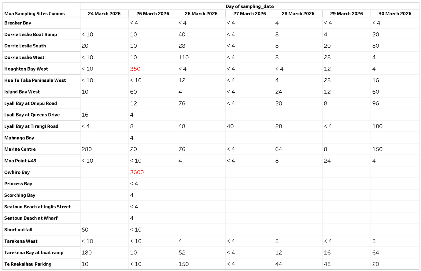 Wellington Water has released the results of water sampling for the week between 24 to 30 March around the Moa Point Wastewater Treatment Plant short outfall pipe and southern coast beaches.