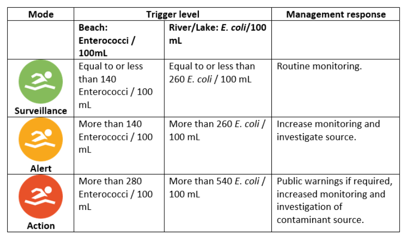 - We are reporting levels of enterococcus only, as these are the most reliable indicator of recent faecal contamination and correlate best with human health risks.