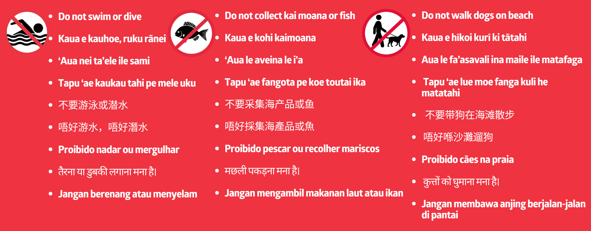 - Do not swim, dive, fish or collect kai moana/shellfish. Do not walk dogs on the beach or come into contact with sea water.